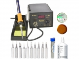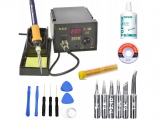 Kupując tą stacje otrzymujemy pięć urządzeń, które mogą pracować niezależnie lub jednocześnie. Dzięki temu te urządzenia zajmują mniej miejsca, są praktyczniejsze, oszczędzają energię. Stacja lutownicza sterowana jest dwurdzeniowy mikro-kontrolerem, dzięki temu lutownica i zasilacz mogą pracować niezależnie. Urządzenie posiada system automatycznego chłodzenia po wyłączeniu stacji. Pozwala to na wydatne ograniczenie zużycia elementu grzejnego stacji na gorące powietrze. Stacja zapamiętuje ostatnio nastawioną temperaturę. Zarówno temperaturę gorącego powietrza jak i lutownicy grotowej. Stabilny i wydajny wydmuch powietrza zapewniany jest przez kompresor. Zapewnia to trwałość i niezawodność urządzenia. Pełna i płynna regulacja mocy nadmuchu, nastawiana za pomocą potencjometra, temperatura regulowana jest za pomocą przycisków, wszystkie parametry są widoczne na wyświetlaczu LED. DYSZE: Wraz ze stacją otrzymujesz zestaw dysz, dzięki temu od razu możesz rozpocząć prace z urządzeniem. Komplet dysz: