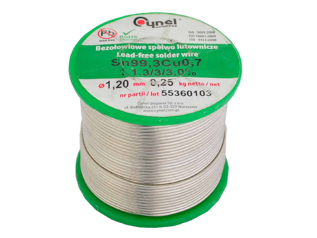 Wysokiej jakości spoiwo lutownicze/cyna w drucie z topnikiem do zastosowań w elektronice i elektrotechnice. Zawartość cyny: 99,3% Zawartość miedzi: 0,5 +/- 0,7% Minimalna czystość surowców użytych w wytopie: 99,90% Maksymalne zanieczyszczenia:
