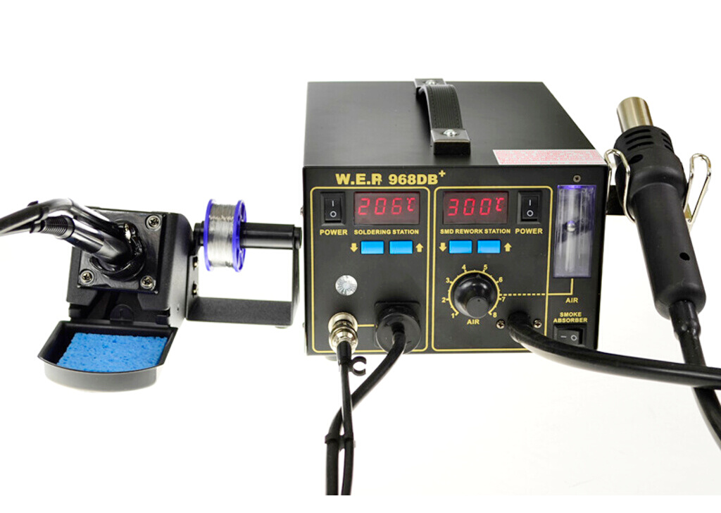 Lutownica WEP 968DB+ to stacja lutownicza na gorące powietrze oraz lutownica grotowa o szczytowej mocy 75W z odciągiem oparów z pod grota. Stacja wyposażona jest w mikroprocesor SAMSUNG, który sprawdza parametry pracy stacji i koryguje je do zadanych wartości.
