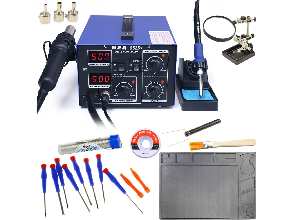 WEP jest wiodącym producentem lutownic ma ponad 80 modeli lutownic i stacji lutowniczych. Wszystkie dysze mają ten sam standard używany przez wielu producentów. Stacja WEP 852D+ to stacja lutownicza 2w1 na gorące powietrze, służąca do wylutowywania i wlutowywania układów elektronicznych np. BGA, SMD i itd. oraz stacja lutownicza grotowa o mocy 60W. Stacja posiada wbudowane dwa wyświetlacze LED informujący o nastawionej temperaturze gorącego powietrza oraz grotówki. Stacja posiada również płynna regulacje siły nadmuchu Hotair. Stacja WEP 852D+ jest zaprojektowana antystatycznie ESD Safe co chroni elementy lutowane przed uszkodzeniem. Szerokie zastosowanie i znikoma awaryjność urządzenia daje jej czołowe miejsce na rynku stacji lutowniczych. Obydwa moduły stacji czyli grotówka i Hotair mogą pracować niezależnie od siebie. Stacja wyposażona jest dodatkowo w system automatycznego chłodzenia po zakończeniu pracy. W efektywny sposób wydłuża to żywotność elementu grzejnego. Dzięki dużej mocy 60W i szybkości nagrzewania stacja grotowa nadaje się obok lutowania ołowiowego do lutowania w technice bezołowiowej (lead free). Stacja posiada solidną metalową obudowę. Wydmuch powietrza realizowany jest poprzez kompresor, dzięki temu mamy pewność długotrwałej, bezawaryjnej pracy ze stabilnością siły nadmuchu. Trzecia ręka to uchwyt pomocniczyMontażowy ze szkłem powiększającym (lupa) ze szkła, która wzmacnia widoczność. Cała podstawa jest ciężka i żeliwna, stoi stabilnie, dzięki czemu ułatwia pracę i się nie przesuwa. Dzięki wolnym rękom uchwyt pozwoli ci na takie prace jak :