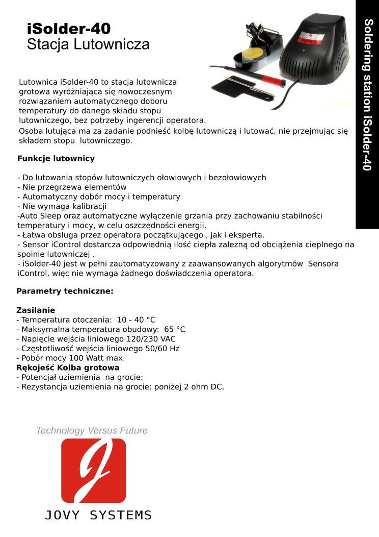 Lutownica iSolder-40 to stacja lutownicza grotowa wyróżniająca się nowoczesnym rozwiązaniem automatycznego doboru temperatury do danego składu stopu lutowniczego, bez potrzeby ingerencji operatora lutownicy. Osoba lutująca ma za zadanie podnieść kolbę lutowniczą i lutować, nie przejmując się składem stopu lutowniczego. Funkcje lutownicy
