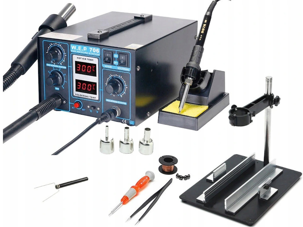 Stacja WEP 706 to stacja lutownicza 2w1 na gorące powietrze, służąca do wylutowywania i wlutowywania układów elektronicznych np. BGA, SMD i itd. oraz stacja lutownicza grotowa o mocy 60W. Stacja posiada wbudowane dwa wyświetlacze LED informujący o nastawionej temperaturze gorącego powietrza oraz grotówki. Stacja posiada również płynna regulacje siły nadmuchu Hotair, a dzięki technologii Twin Turbo uzyskujemy moc nadmuchu do 168L/min.