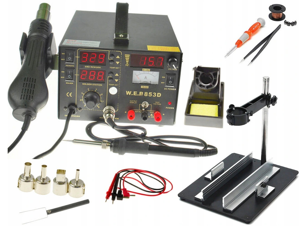 Stacja lutownicza WEP 853D 5w1 : hotair, grotówka 60W, zasilacz 15V 1A, tester RF, miernik