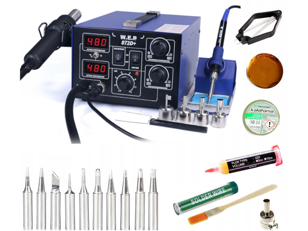 SET536 Stacja lutownicza WEP 872D+ 2w1 to lutownica na gorące powietrze i lutownica grotowa o mocy 75W +Dodatki
