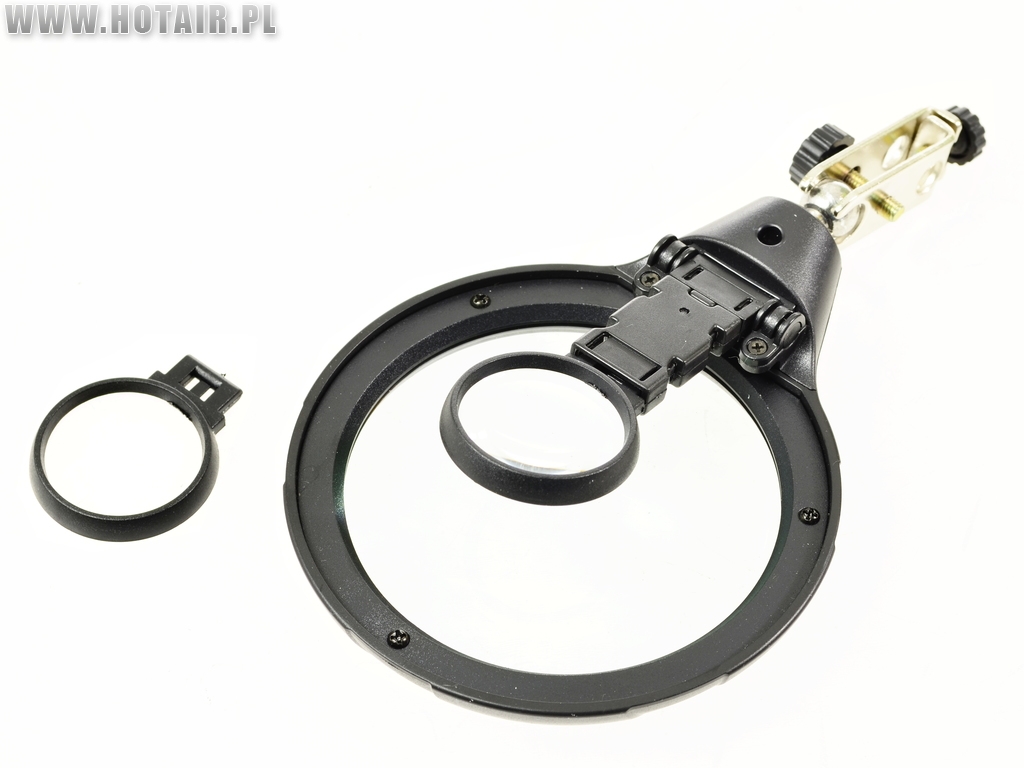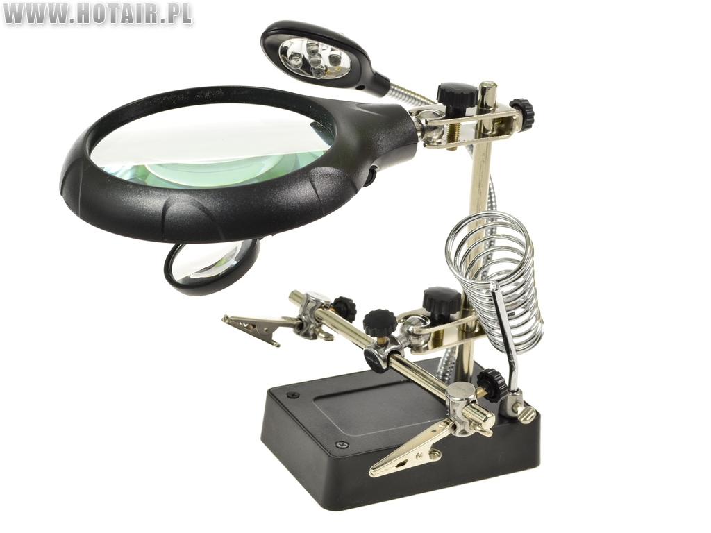 Trzecia ręka ZD-126-3 to uchwyt montażowy z dużym szkłem powiększającym i dwoma mniejszymi lupami które można zdemontować, podświetleniem LED, spiralnym uchwytem na kolbę lutowniczą, z żeliwną podstawą.