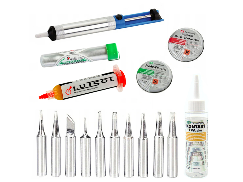 DodatkiZestaw sprawdzonych grotów do lutowania kolbą grotową. Groty są skompletowane pod względem przydatności w serwisie elektronicznym. Cyna z topnikiem stosowana w serwisie elektronicznym, do produkcji standardowych urządzeń i podzespołów elektronicznych, elektrotechnice. Topnik flux w żelu RMA 223 to bardzo dobrej jakości aktywny topnik do pracy ze stacjami lutowniczymi z elementami takimi jak BGA, SMD. SOP, PLCC Aktywna kalafonia charakteryzująca się bardzo dobrą jakością jest z dodatkiem aktywatorów ułatwiających lutowanie. Pasta ułatwiająca lutowanie elementów: miedzianych, srebrzonych, cynkowanych oraz niklowanych, stosowana jest tam, gdzie nie wystarcza kalafonia. Odsysacz cyny służący do usuwania spoiwa lutowniczego. Jest to solidna konstrukcja o wysokiej mocy ssącej, umożliwiająca pracę jedną ręką. Uniwersalny preparat do czyszczenia urządzeń Kontakt IPA do czyszczenia płytek drukowanych z pozostałości po procesie lutowniczym.