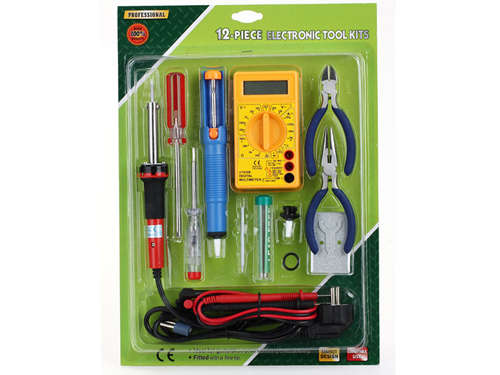 Zestaw ZD-920A to idealny zestaw dla początkującego elektronika. Posiada poręczną lutownice grotową z zapasowym grotem. W zestawie są elementy jak odsysacz, śrubokręty, obcęgi itd. które są niezbędne przy pracy z elektroniką. Dodatkowo dostajemy miernik elektroniczny DT830B. Parametry miernika DT830B Wykonuje pomiary: