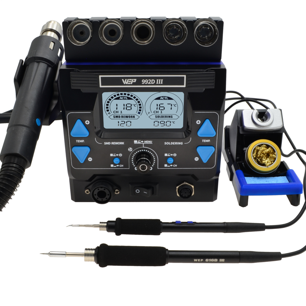 Profesjonalna stacja lutownicza WEP 992D-III to nowoczesne, precyzyjne urządzenie 2w1 łączące funkcje lutownicy hot air oraz dwie kolby grotowe (C245 i C210). Zaprojektowana dla serwisów elektronicznych, laboratoriów i warsztatów precyzyjnych, zapewnia maksymalną kontrolę temperatury, wydajność oraz bezpieczeństwo pracy.