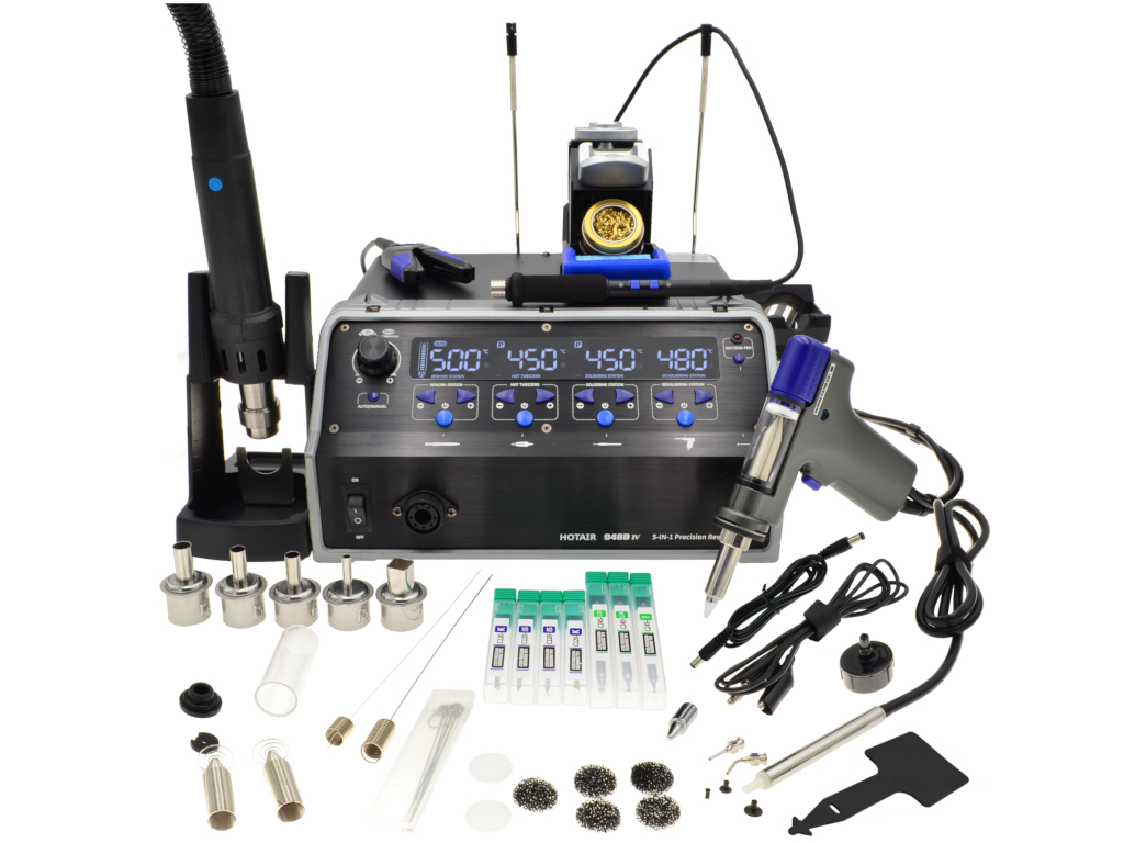 HOTAIR 948D-IV to zaawansowana, profesjonalna stacja lutownicza 5w1, która łączy w jednej obudowie aż pięć niezależnych urządzeń: kolbę lutowniczą C245, rozlutownicę, termopęsetę, chwytak podciśnieniowy oraz kolbę Hot Air. To kompleksowe rozwiązanie do każdego warsztatu elektronicznego, które zapewnia maksymalną wydajność, oszczędność miejsca i pełną kontrolę nad procesami lutowania.