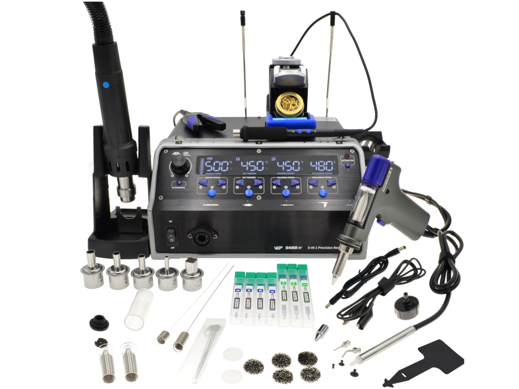 WEP 948D-IV to zaawansowana, profesjonalna stacja lutownicza 5w1, która łączy w jednej obudowie aż pięć niezależnych urządzeń: kolbę lutowniczą C245, rozlutownicę, termopęsetę, chwytak podciśnieniowy oraz kolbę Hot Air. To kompleksowe rozwiązanie do każdego warsztatu elektronicznego, które zapewnia maksymalną wydajność, oszczędność miejsca i pełną kontrolę nad procesami lutowania.