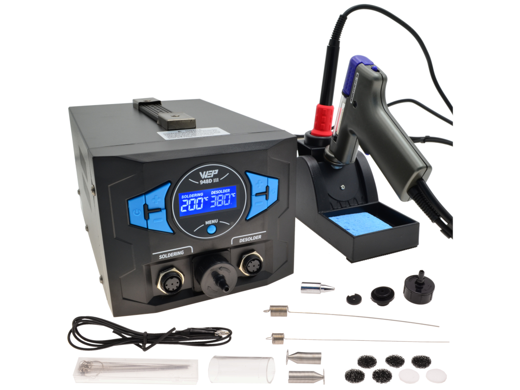 Profesjonalna stacja WEP 948D-III 2w1 łączy funkcje rozlutownicy i lutownicy grotowej, oferując wszechstronne narzędzie do serwisu elektroniki. Urządzenie o mocy 290 W oraz kolbie ssącej 74 W zapewnia szybkie nagrzewanie i stabilną temperaturę dzięki precyzyjnemu systemowi PID, co gwarantuje wysoką dokładność pracy i bezpieczeństwo elementów elektronicznych.