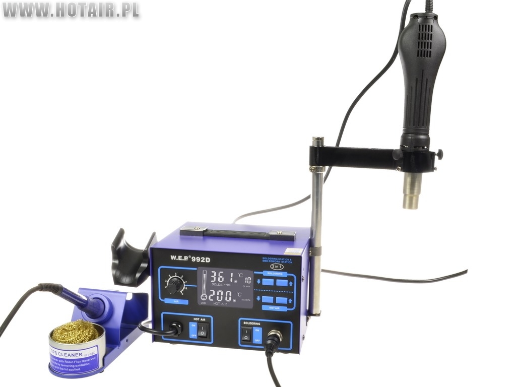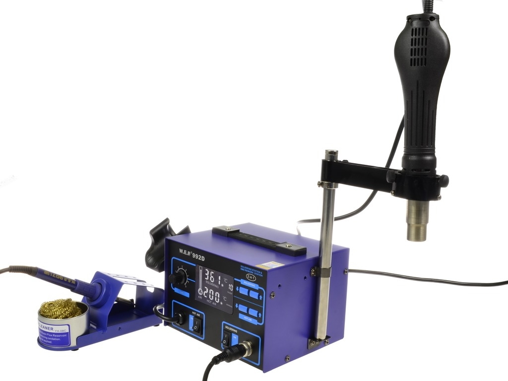 Stacja lutownicza WEP 992D ze statywem to urządzenie 2w1 na gorące powietrze oraz grotowa. Służąca do wylutowywania i wlutowywania układów elektronicznych np. BGA, SMD i itd.  oraz stacja lutownicza grotowa o mocy 75W.  Stacja posiada wbudowany  wyświetlacz LCD informujący o nastawionej temperaturze gorącego powietrza, grotówki oraz mocy nadmuchu.
