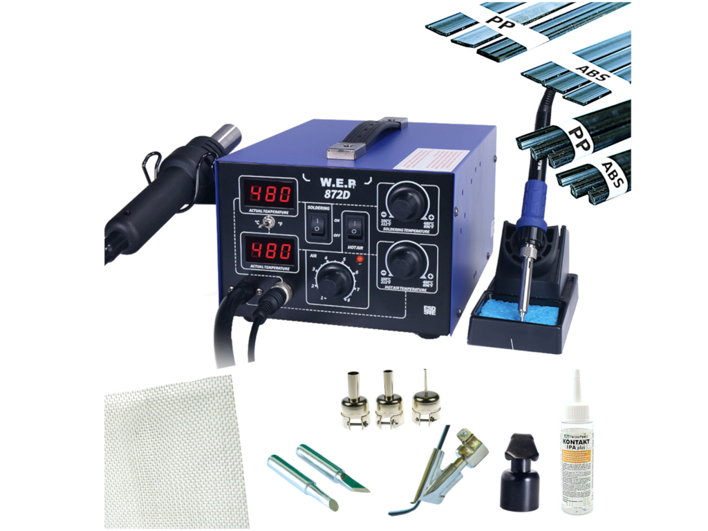 Spawarka WEP 872D to urządzenie 2w1 na gorące powietrze do spawania plastiku oraz grotowa, służąca do wylutowywania i wlutowywania układów elektronicznych WEP 872D to spawarka mająca najlepsze cechy stacji serii 852, wyposażona w najnowszy procesor kontroli temperatury PID. Stacja pokazuje temperaturę lutownicy na gorące powietrze i temperatura lutownicy grotowej. Dzięki kontrolerowi PID otrzymujemy spawarkę o wysokiej stabilności zadanej temperatury oraz szybkiej reakcji na jej zmianę. WEP 872D wyświetla temperatury w stopniach C lub F. Sterowanie spawarki odbywa się za pomocą jednego mikroprocesora, dzięki temu otrzymujemy wysoką stabilność pracy, oraz wysokie bezpieczeństwo przy lutowaniu. Spawarka gorącego powietrza oraz lutownica grotowa, mogą pracować niezależnie od siebie. Spawarka WEP 872D wyposażona jest dodatkowo w system automatycznego chłodzenia, tzn. po zakończeniu pracy schładzana jest grzałka gorącego powietrza do bezpiecznej temperatury, to w efektywny sposób wydłuża żywotność elementu grzejnego. Spawarka posiada solidną metalową obudowę. Wydmuch powietrza realizowany jest poprzez kompresor, dzięki temu mamy pewność długotrwałej, bezawaryjnej pracy ze stabilnością siły nadmuchu. Obliczenie opłacalności wykonania spawań Zazwyczaj cenę usługi oblicza się na podstawie rodzaju pęknięcia:
