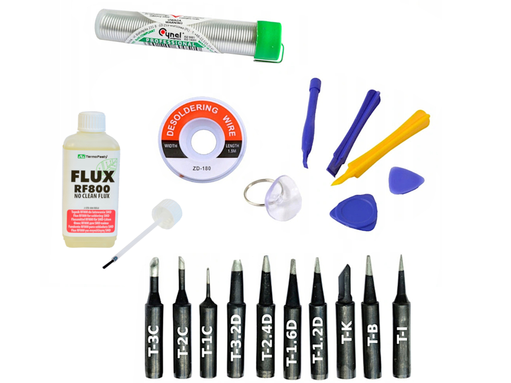 Zestaw dodatków do lutowaniaGroty 900M otwieracze plecionka cyna topnikCo w komplecie: