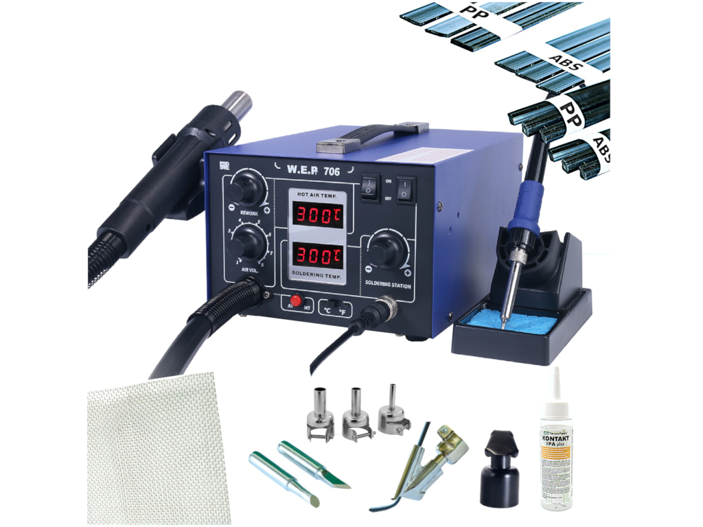 SPAWARKA O NAJWIĘKSZEJ MOCY NADMUCHU do 168L/minMulti kombajn 706 - spawanie plastiku i lutowanie - do warsztatu samochodowego Bardzo mocna i wytrzymała grzałka - drut na rdzeniu Wbudowana lutownica kolbowa-grotowa do lutowania w serwisie NAWIEW uzyskiwany w technologi Twin Turbo ZESTAW ZAWIERA: