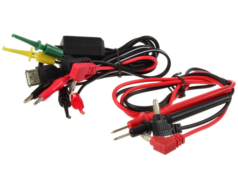 2. Przewody połączeniowe 7 końcówek (2x banan na 4x pazurek + 2x krokodylek + USB)